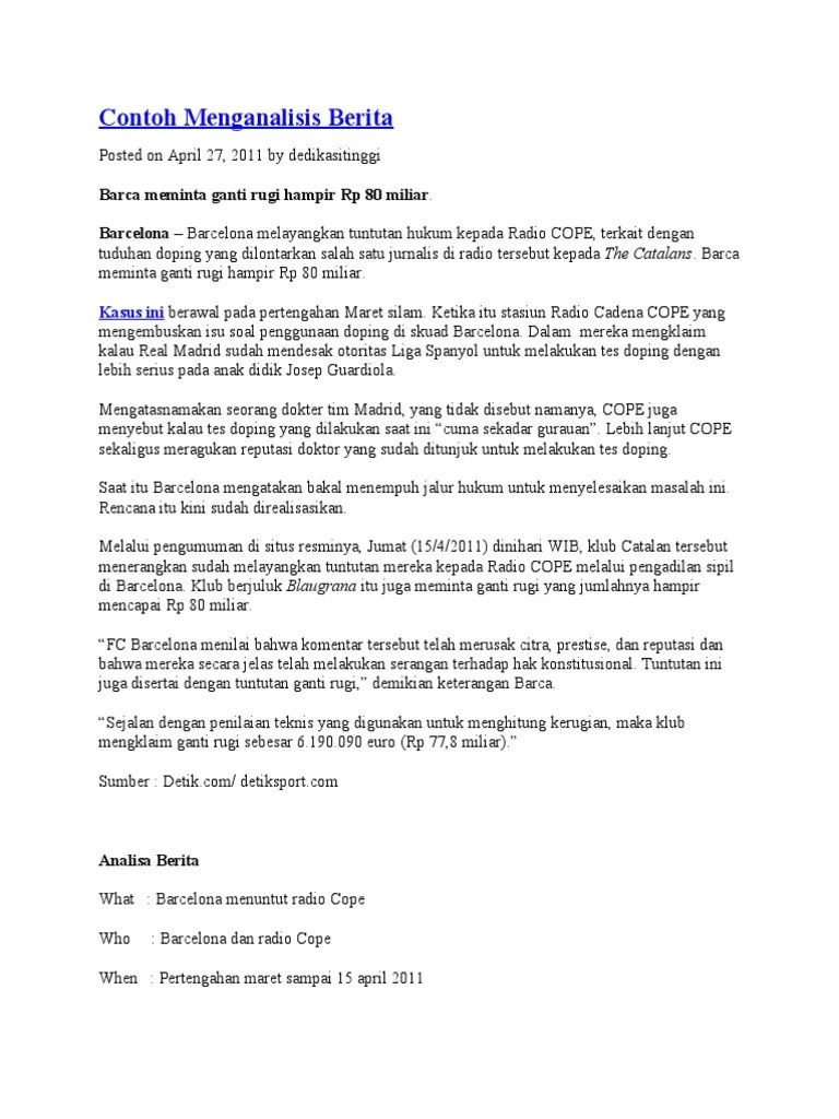 Pos kota, senin 11 april . Barca meminta ganti rugi hampir rp 80 miliar. Tugas akhir analisis berita diajukan untuk memenuhi tugas mata perkuliahan pendidikan kewarganegaraan oleh evia fajriati kusmana 1112017000027 pendidikan . Analisis struktur teks berita pengantar wilayah kota bogor. Exemplar mengaitkan bingkai dengan contoh, teori atau pengalaman masa silam. Pencarian pesawat malaysia mh 370 dihentikan. Berisi tulisan analisis dari pakar, profesional, pengamat politik, kader partai, pertahanan,. Jelajahi koleksi gambar, foto, dan wallpaper kami yang sangat luar biasa. Disini saya mengambil sebuah contoh kasus dari portal berita online pontianak post yang membahas salah satu topik berita mereka yaitu kabut . Apakah anda mencari gambar tentang contoh analisis berita? Beberapa metode yang digunakan untuk menganalisa berita, analisis isi. Analisis 05 november 2021 14:30 wib . Unsur teks berita itu terangkum dalam 5w 1h apa dimana siapa kapan mengapa bagaimana.